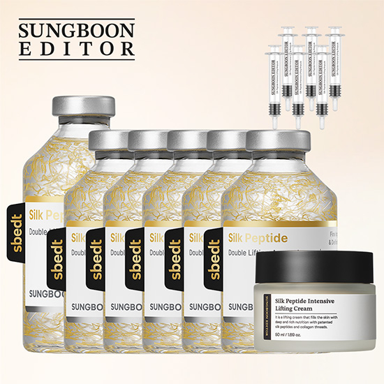 실크수(670,000 ppm), 부틸렌글라이콜,정제수,글리 세린, 메틸프로판다이올, 1,2-헥산다이올, 나이아신아마이드, 카보머,피피지-13-데실테트라데세스-24, 트로메타민, 프로 판다이올, 아이리쉬모스가루, 아가, 아데노신, 하이드록시에틸 셀룰로오스, 다이소듐이디티에이, 아크릴레이트/C10-30알킬 아크릴레이트크로스폴리머, 합성플루오르플로고파이트, 돌콩 펩타이드(100 ppm), 베타인, 판테놀, 티타늄디옥사이드, 적색 산화철, 마이카, 젤란검, 하이드롤라이즈드콜라겐, 마그네슘아 스코빌포스페이트, 병풀추출물, 약모밀추출물, 흑색산화철, 틴 옥사이드, 에틸헥실글리세린, 스쿠알란, 하이드로제네이티드 폴리아이소부텐, 벤질글라이콜, 레시틴, 하이드롤라이즈드글 라이코사미노글리칸, 소듐하이알루로네이트, 카프릴릴글라이 콜, 하이드로제네이티드레시틴, 에스에이치-폴리펩타이드-121(202 ppb), 카프릴릭/카프릭트라이글리세라이드, 소듐팔미 토일사코시네이트, 토코페롤, 카페오일헥사펩타이드-65(102 ppb), 소듐하이알루로네이트크로스폴리머, 아세틸글루타민, 하이드롤라이즈드하이알루로닉애씨드, 헵타소듐헥사카복시 메틸다이펩타이드-12(52 ppb), 바실러스/폴릭애씨드/돌콩발 효추출물, 금, 다이펩타이드다이아미노부티로일벤질아마이드 다이아세테이트(27 ppb), 소듐포스페이트, 콜라겐, 하이드록 시프로필트라이모늄하이알루로네이트, 미리스토일펜타펩타 이드-17(12 ppb), 미리스토일펜타펩타이드-4(12 ppb), 덱스 트란, 벤조익애씨드, 소듐벤조에이트, 수용성콜라겐, 하이드롤 라이즈드엘라스틴, 팔미토일펜타펩타이드-5(7 ppb), 아세틸 테트라펩타이드-3(5 ppb), 카퍼트라이펩타이드-1(4 ppb), 팔 미토일펜타펩타이드-4(3 ppb), 아세틸헥사펩타이드-8(3 ppb), 붉은토끼풀꽃추출물, 팔미토일테트라펩타이드-7(2 ppb), 에스 에이치-데카펩타이드-7(2 ppb), 에스에이치-옥타펩타이드-4 (2 ppb), 에스에이치-올리고펩타이드-9(2 ppb), 에스에이치- 펜타펩타이드-19(2 ppb), 팔미토일트라이펩타이드-1(2 ppb), 트라이펩타이드-32(2 ppb), 에스알(올리고펩타이드-91클로 스트리듐보툴리눔폴리펩타이드-1)(2 ppb), 에스에이치-올리 고펩타이드-1(2 ppb), 에스에이치-폴리펩타이드-1(2 ppb), 에스에이치-올리고펩타이드-2(2 ppb), 에스에이치-폴리펩타 이드-11(2 ppb), 에스에이치-폴리펩타이드-9(2 ppb), 에스에 이치-폴리펩타이드-16(2 ppb), 에스에이치-폴리펩타이드-22 (2 ppb), 에스에이치-폴리펩타이드-3(2 ppb), 에스에이치-폴 리펩타이드-19(2 ppb), 에스에이치-폴리펩타이드-62(2 ppb), 하이알루로닉애씨드, 지모뿌리추출물, 소듐아세틸레이티드하 이알루로네이트